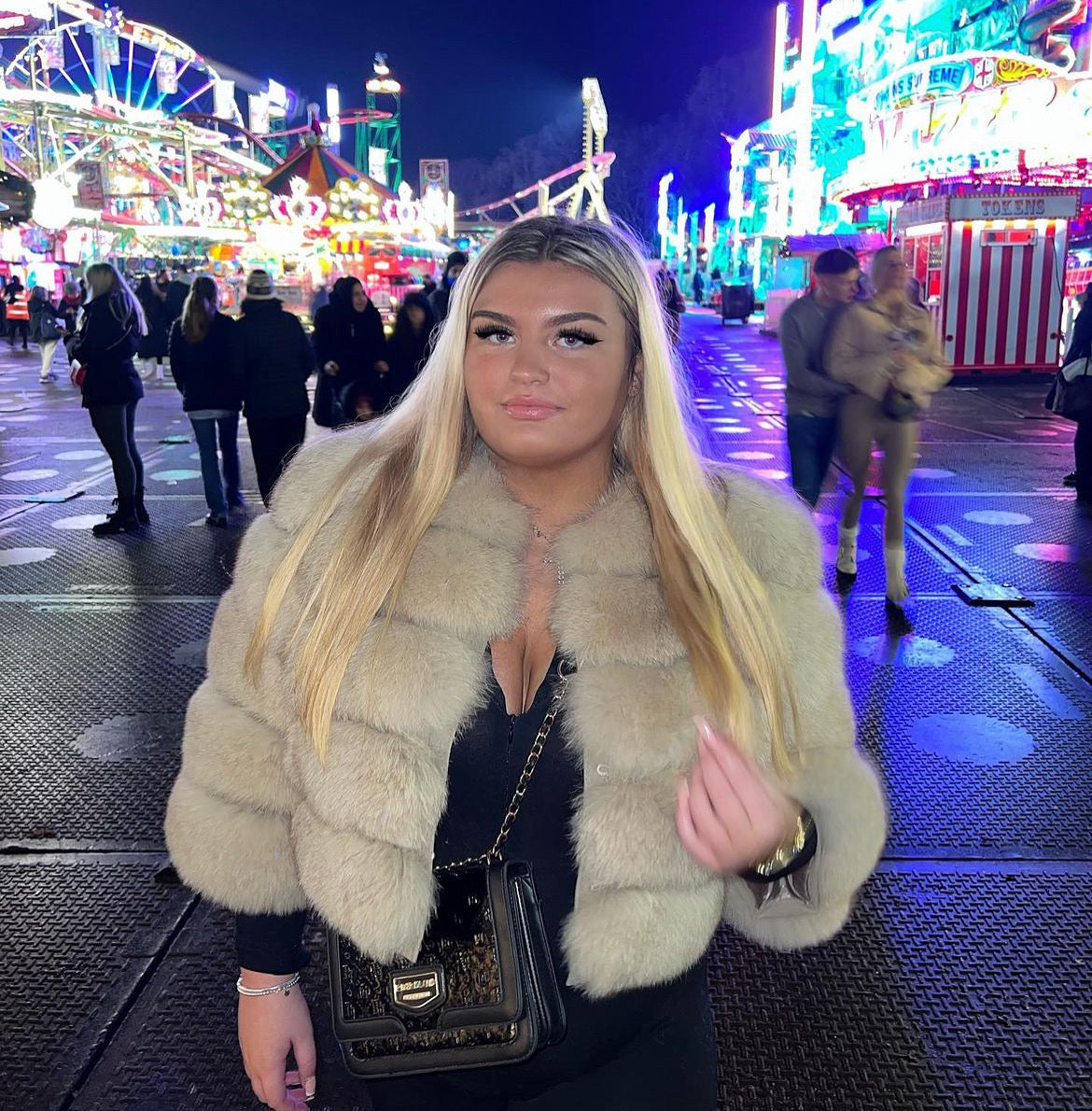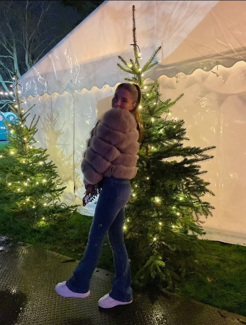 ‘Beige’ Premium 5 Row Cropped Sleeve Fox Fur Coat (10/18 Day Delivery)
