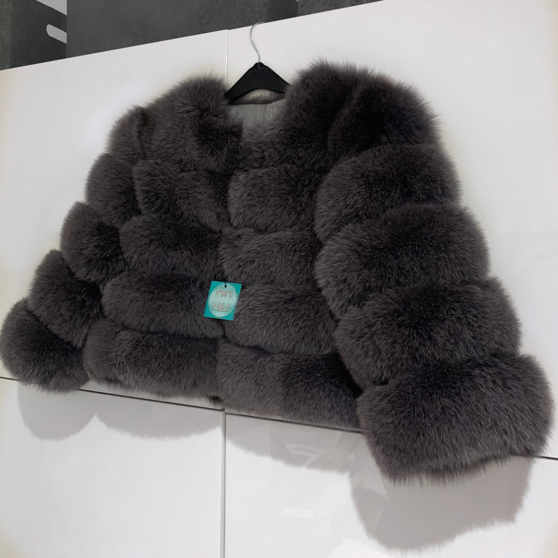 ‘Medium Grey’ Premium 5 Row Cropped Sleeve Fox Fur Coat (10/18 Day Delivery)
